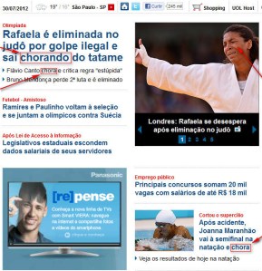 A CAPA do UOL de hoje às 09:28 indicava o choro de duas atletas brasileiras, uma delas com a foto das próprias lágrimas. Uma chorava pela derrota (Rafaela) e outra chorava pela vitória (Joanna). O técnico também chorava. Praticamente um enterro!