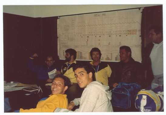 Coaches Sidão, Ali, Tião, Sergio, com a turma do Dr Mazza em Rosário – Argentina. Alexandre Hermeto e Marcelo Grangeiro a frente. Notem o plano de treinos para Seul 88