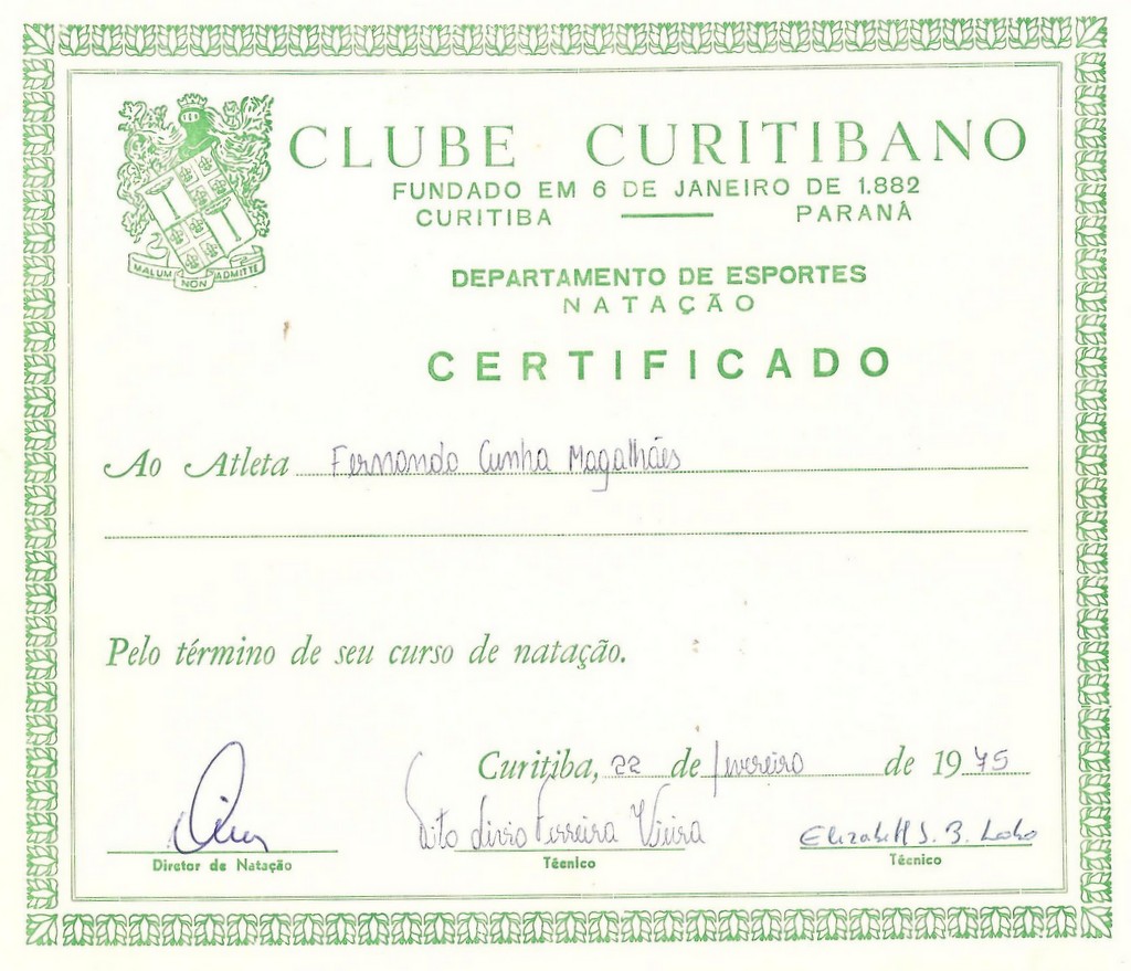Certificado do meu 1o curso de natação. Verão de 1975.