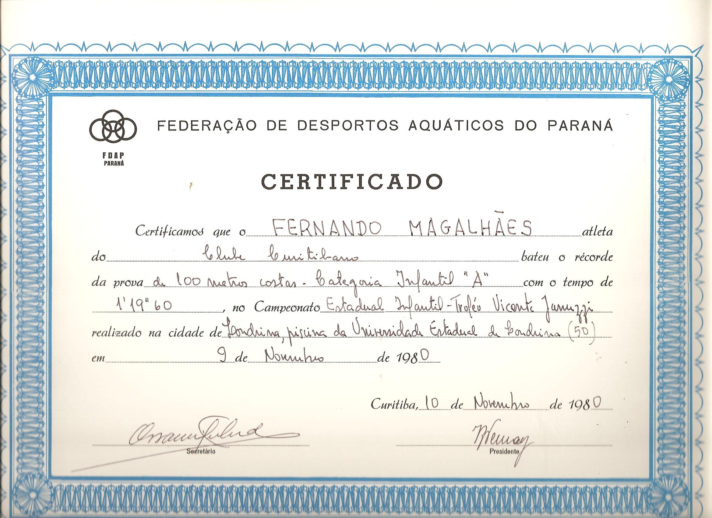 Perdi de meio corpo nos 100m borboleta. Nos 100m costas ganhei meu primeiro campeonato estadual e bati meu primeiro recorde paranaense com 1m19s60, quebrando a marca que havia rendido o bronze para Eduardo De Poli no brasileiro do ano anterior.
