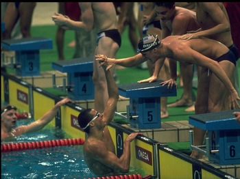 21 SEP 1988: MATT BIONDI (IN WATER) AND TROY DALBEY OF THE UNITED STATES PERFORM A HIGH FIVE AFTER CLAIMING VICTORY IN THE FINAL OF THE 4×200 METRE FREESTYLE RELAY AT THE 1988 SEOUL OLYMPICS. THE OTHER MEMBERS OF THE WORLD RECORD BREAKING TEAM WERE MATTHEW CETLINSKI AND DOUGLAS GJERTSEN.