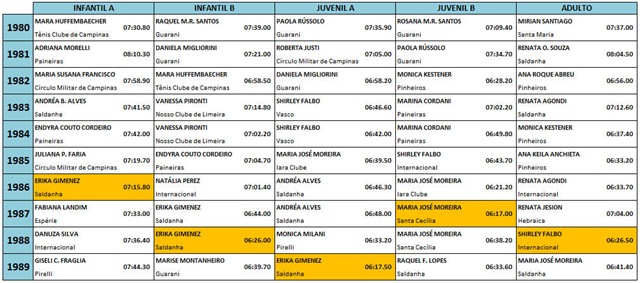 Muito legal trazer de volta essa prova tão famosa. Mas tenho a mesma opinião da Marina Cordani: detestava a prova! Ganhei dois bronzes nem sei como, fiquei no pódium com nadadoras muito fortes (Shirley Falbo, Mara Hoffenbauch, Maria Cecília Giacaglia), e eu perdida lá… Tenho uma foto muito engraçada que mostra o tamanho dessas meninas na época e o meu… o antebraço delas dava meu bíceps e tríceps, contraídos, juntos!