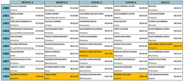 Mas a melhor história minha foi dos meus pais numa posição estratégica de boa visão da chegada, mas não a chegada mesmo, contando as posições e quando chegaram no 33, 34, 35, começaram a pensar no que falar prá me consolar, pq. esse ano eu tava bem e queria chegar entre as 10… 36, 37, 38, eles esperando um escândalo e muito choro (típico meu na época Infantil A/B. Ok, talvez um pouco no Juvenil… ), aí alguém pergunta o que eles tavam fazendo, pq. íam perder o pódium e eu tava em terceiro!