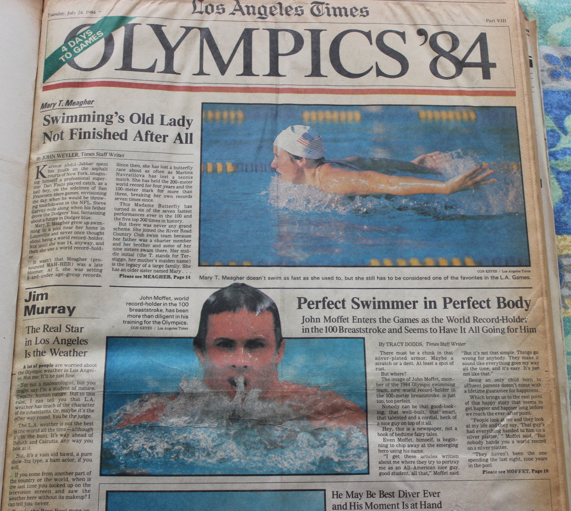 IMG_4011Quatro dias antes dos jogos o jornal Los Angeles Times daria a Moffet a capa do suplemento olímpico, com a manchete “Perfect swimmer in perfect Body”. Diz o texto: “Ninguém pode ser tão bonito assim, com o corpo tão bem moldado, inteligente, talentoso, cordial, um homem acima dos outros.” Exagero? Moffet prova que é cordial e simpaticamente se defende, dizendo: “Não é tão simples assim. As coisas podem dar errado para qualquer um. Eles fazem soar como se tudo ocorresse do meu jeitinho e sempre desse tudo certo para mim. Na verdade não é bem assim.