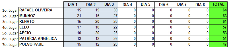 Bom, vamos agora ao que interessa, ao papelão do Polvo Paul. Rodada muito forte entre os participantes, com Rafael Oliveira vencendo a rodada com 30 pontos e assumindo a liderança isolada. Munhoz mantem a prata e Renato continua no seu cangote. Patricia Angélica teve um bom desempenho e encostou em Aécio. Já Paul e Lelo decepcionaram e estão em ritmo de queda.