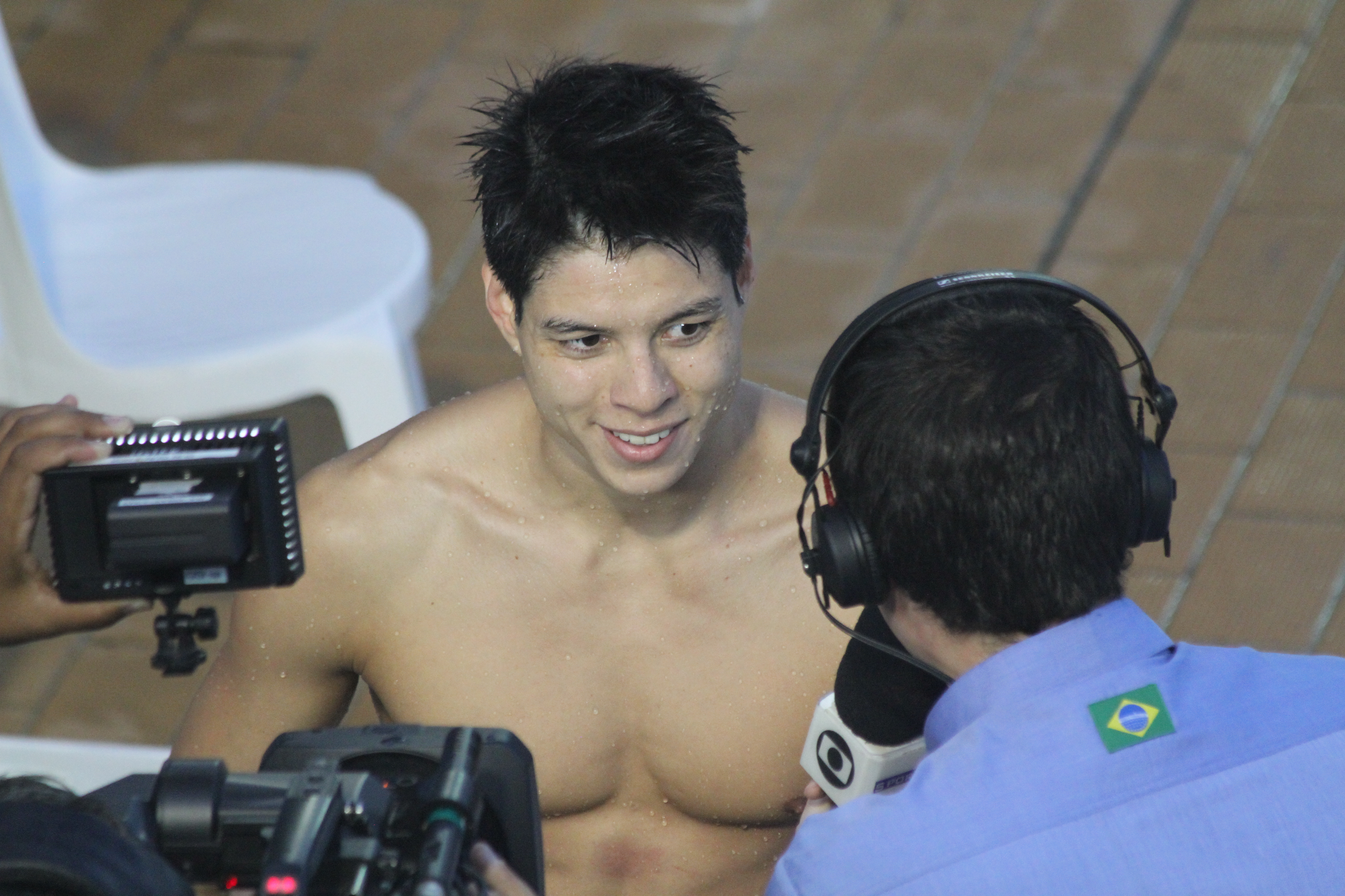 Santi , ainda surpreso, dando entrevista pra TV depois de ganhar os 100 Costas