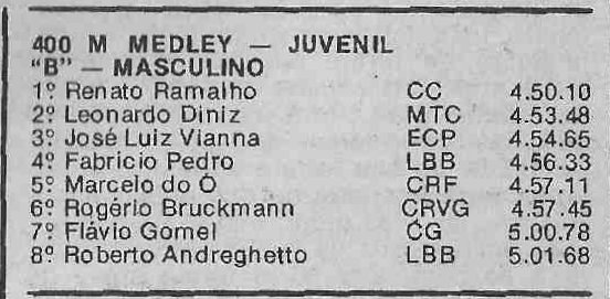 Não lembro dos meus resultados nessa competição (a foto dos resultados me parece com pouca resolução) , mas lembro da desclassificação nos 400 medley. O poder da culpa é algo realmente fantástico!! Após a prova, o juiz que me desclassificou me procurou para dar-me uma explicação (???) e disse que eu havia afundado a cabeça 08 vezes. Na hora perguntei ao tão zeloso árbitro: ” Você só olhou para mim, e os outros 07 que estavam nadando, esqueceu-se deles?”. Sem resposta para dar e como eu estava acompanhado de outros dois atletas, ele ficou muito sem graça e saiu de fininho (coincidentemente, essa foi a única desclassificação em toda a minha carreira). Portanto Maga, eu não dei bobeira, afirmo categoricamente que deram “bobeira” por mim.