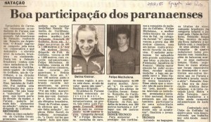 Foi um grande e inédito feito para a natação paranaense ter 5 atletas convocados. Isso já foi uma injeção de ânimo para a natação do nosso estado, mas além disso, Betina Kleiner, Felipe Michelena, Luiz Fernando Graczyk e Eduardo De Poli do Clube do Golfinho e Renato Ramalho do Clube Curitibano deram um show.