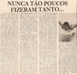 Bacana o post. Mais ou menos como p o Lelo, 85 foi o ano da virada p mim. Estava desanimado ateh agosto, nadando muito mal, longe dos indices de JD. O Eleandro, tec do juv A, teve cancer, se afastou e o Alberto assumiu o A e o B do Fla. Eu n sei dizer qtas pessoas treinavam mas acredito q eram umas 100. O espirito de uniao foi enorme num ano em q tinham vindo varios atletas de outos clubes, muita gente do Tijuca e de fora do Rio. Anselmo Amim, Ronaldo Herszenhaut, Claudio Rosa, Perisse, Eduardo Toledo, os Jinkings e muitos outros. Nossa equipe no JD tinha mais de 60 atletas. Uma conversa do Alberto primeiro comigo e depois c minha mae mudou tudo. Nao falo da parte tecnica mas do educador. Em alguns minutos ele me convenceu q eu era capaz de fazer qq coisa se acreditasse em mim e ele acreditava. Olhando hj parece mentira a transformacao em mim. Baixei quase 10s nos 200L em 3 meses e fiz o indice do JD. Eu via os tempos q os caras faziam nos tiros pra tempo de madrugada e parecia mentira. Faziam 25/26 nos 50 e 55/56 nos 100L. Pra juv A na epoca as 5:30/6 da matina era sinistro. O legal da historia eh q vendo de perto, vc acaba achando q eh possivel fazer os mesmos tempos. No ano seguinte fiz tempos proximos do Gilberto (fiquei a 0,1s do rec est dos 50L e 0,5s nos 100L) mas o patamar no Brasil baixou muito c a entrada em cena do Michelena e do Jr. Mas isso eh outra historia … gr ab