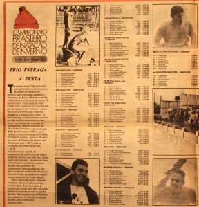 Muito frio!!! Na arquibancada todo mundo enrrolado no cobertor dos hotéis! Lembro bem da disputa pela refeição com o Flamengo que obviamente tinha uma equipe bem maior que a nossa! Aliás uma equipe cheia de estrelas também! Foi minha primeira medalha de brasileiro! 3 nos 200 medley. O vapor da piscina com o frio as vezes não dava pra ver a piscina direito da arquibancada!