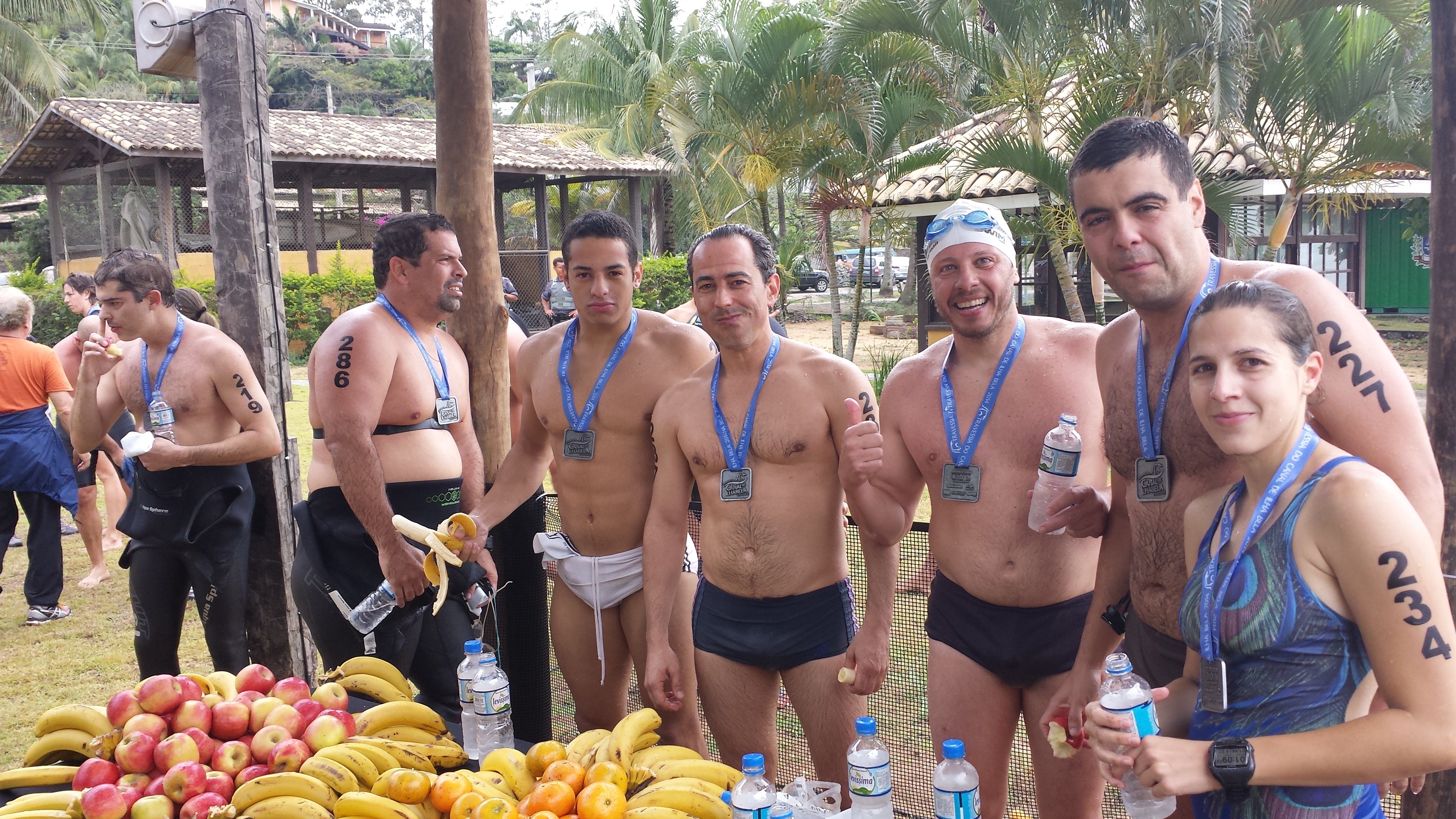 Obtendo as frutas no fim da prova. Notem o grande número de nadadores com trajes.