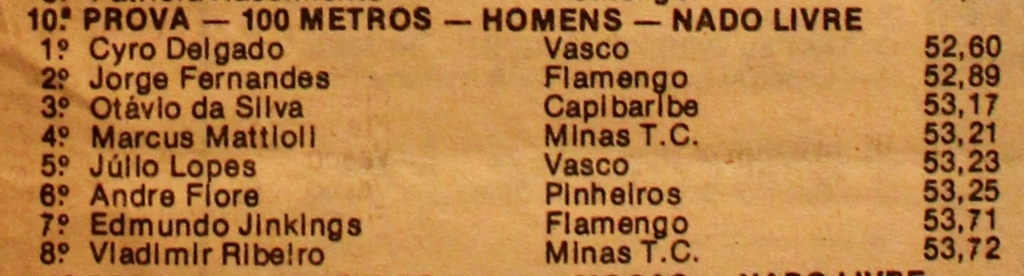 Nos 100m livre, Kaminski quebrou o recorde paranaense com 54s12 na eliminatória e ficou com o 9º tempo – o que ele fazia ali diante da perspectiva de nadar a final dos 200m peito para buscar o ouro e a vaga para o mundial, hoje é difícil de entender. Certamente um erro, mas não me lembro de termos sequer cogitado que ele não nadasse. E eu fiz 55s12, piorei 37 centésimos da minha melhor marca obtida na final do Julio de Lamare e fiquei em 18º. Único da equipe a não classificar para a tarde. Frustração.