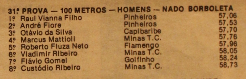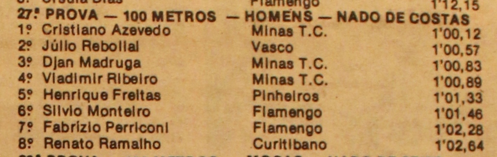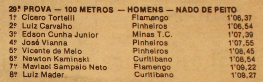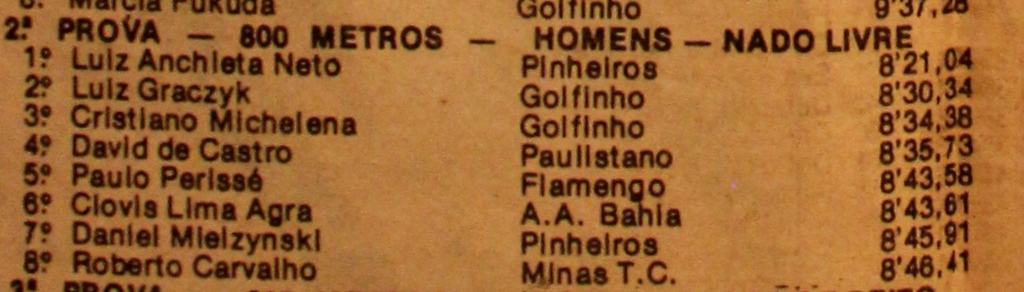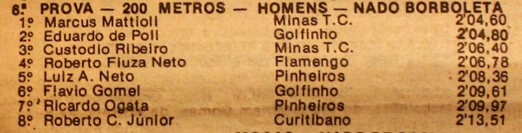 Maga, parabéns pelo brilhante texto e muito obrigado por me fazer reviver todos aqueles momentos tão bem relatados. Foi minha última participação em uma competição na carreira. Por não ter conseguido minha transferência do Curso de Educação Física para Curitiba, havia voltado para Juiz de Fora e ficava treinando sozinho. Sabia das minhas limitações na época, mas estar ali entre todos aqueles nomes da Natação Brasileira me faz sentir fechando com chave de Ouro, defendendo o Clube Curitibano.
