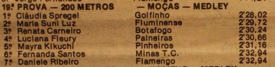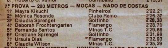 No feminino, uma prova incrível. Eu passava por baixo da arquibancada quando vi a Mayra Kikuchi virar o parcial de peito 4s a frente da Claudia Sprengel. Marcio Latuf, técnico do Pinheiros, estava logo ali em cima e exclamou – “não pega mais!” e sorriu cumprimentando um chegado que estava ao seu lado. Só que a Claudinha levantou uma perna 6 tempos, foi chegando, chegando e … de fato não pegou. Faltaram 4 centésimos para o ouro, que veio no dia seguinte, nos 200m medley.