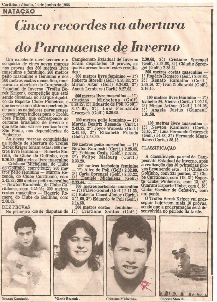 Seguia em ascensão. Eduardo De Poli e Claudia Sprengel, do Clube do Golfinho, foram convocados para o Mundial de Madri. No Curitibano, Renato Ramalho ganhou seu segundo título continental nos 400m medley, agora no Sulamericano absoluto. As duas equipes atraiam atenções e atletas de clubes de dentro e fora do estado.
