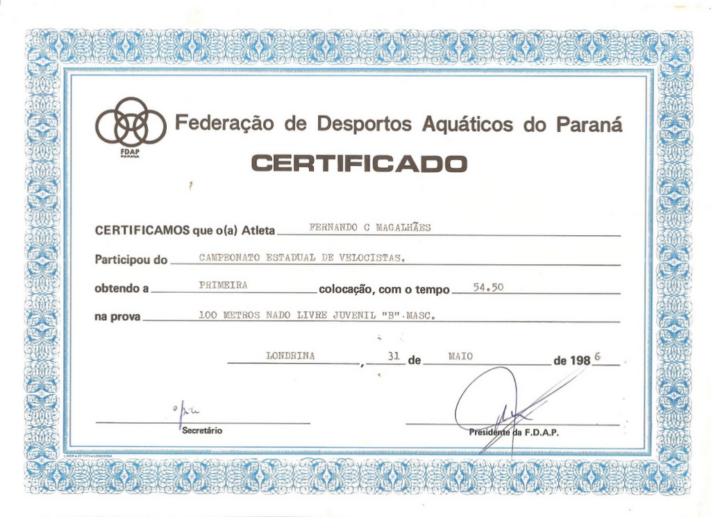 No Regional Sul Absoluto, disputado no Pinheiros (hoje Paraná Clube), o revezamento formado por Newton Kaminski, Renato Ramalho, Tite Clausi e eu quebrou o recorde brasileiro absoluto de 4 x 100m livre em piscina curta. Era uma época em que ninguém polia ou nadava raspado em piscina curta, não havia torneios expressivos e os recordes eram fracos. O de piscina longa era da Seleção Brasileira com 3m27s, obtido nas Olimpíadas de Los Angeles. Fizemos 3m35s21, tempo que para nós foi fantástico e como não tínhamos nada a ver com o fato de ninguém ter feito tempo melhor antes, recebemos com orgulho o diploma abaixo num intervalo da disputa do Troféu José Finkel em São Paulo.