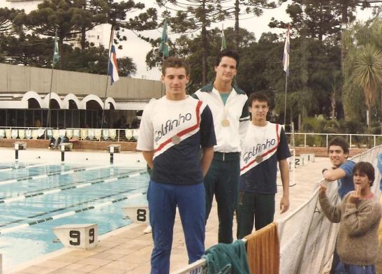 Pódio dos 100m borboleta – Magalhães, De Poli e Romero. Fotos: Francisco Magalhães – meu pai
