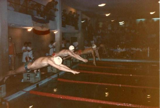 Saída da penúltima série dos 400m livre. Ramalho na raia 4, Magalhães na raia 6. Percebam o público na cabeceira oposta e as senhoras cronometristas.