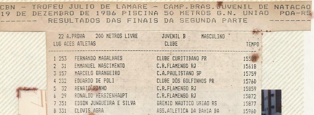 No seu ultimo post comentei que esta teria sido talvez a minha melhor competição da vida. Adorei a tabelinha por falar nisso! Ela resume de uma forma meu ponto. Surgi como bom nadador alguns anos antes, em 1984 quando ganhei todas as provas infantil B em Vitória-ES. Mas os tempos que fiz nesta competição com 15 anos me colocavam entre os melhores do mundo na época. Sem contar que estava alinhado com os vencedores do Juvenil B. Isso foi bastante surreal.