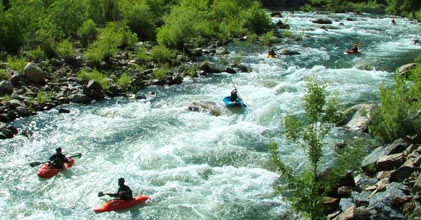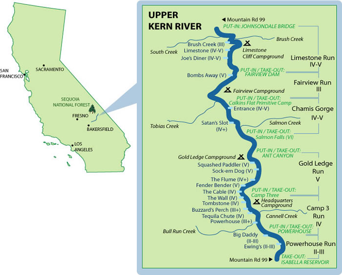 Em 1991, o nadador dinamarquês Chris Bruggert apareceu no treino dizendo que tinha descido o tal Kern em uma boia de borracha e tinha achado sensacional.  O rio intercalava corredeiras bem radicais (nos States chamadas de “rapids”) com longos trechos de calmaria onde a vista das montanhas da Califórnia era sensacional.  A aventura levava um pouco mais de três horas e viciamos já na primeira descida.  Por muito tempo só descíamos durante o “Spring”, uma ou duas vezes por mês, sempre aos finais de semana.  Só que no 2º semestre de 1992, Nels Larsen, outro PEBA velocista, teve a brilhante ideia de montarmos nosso calendário escolar evitando aulas na sexta-feira, reservando a tarde para o Kern.  A ideia inicialmente parecia brincadeira, mas acabou inesperadamente tomando forma e no Spring de 1993 uma boa parte do time de natação passou a fazer rafting no Kern toda sexta-feira.  Outra novidade foi a inclusão de nadadoras nessas aventuras.  O Nels namorava a Nicole, (hoje casados e com dois filhos) e ela difundiu a ideia entre as nadadoras.  O resultado final foi bem bacana.  Chegamos a descer o Rio com mais de 30 nadadores.  Boa parte das meninas entrava no rio num ponto mais abaixo, pois as duas corredeiras mais radicais estavam no início da descida, mas tinha sempre uma ou outra que se aventuravam junto com os homens em todo o percurso.