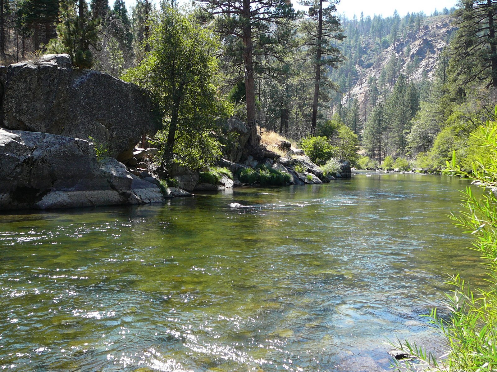 A terceira corredeira era a mais bacana porque tinha poucas pedras fora d’água e a descida era bem gostosa e sem maiores perigos.  Ela desembocava num “piscinão” que por sua vez terminava num canyon onde o visual era espetacular, o mais bonito do percurso.  O canyon terminava em um vale onde tinha, do lado esquerda da margem, um camping abandonado.  Digo abandonado porque tinha umas mesas e bancos, mas nunca vimos ninguém, nem nenhuma barraca, mas também nunca parávamos pra investigar.  Aliás, uma das particularidades das nossas aventuras no Kern era que nunca parávamos na borda.  Eram 3 horas de rio mesmo.