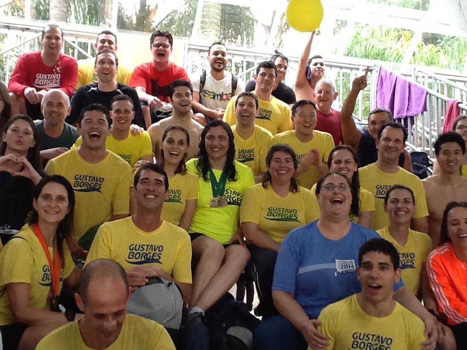Frequentávamos os mesmos torneios, nunca havíamos nos falado. Em 2011, o Dr. Seda, médico endoscopista, sedentário, 18kg acima do peso, e cheio de dores decorrentes das protusões e hérnias da sua coluna, resolveu voltar a nadar e participar de provas de travessias e piscinas. Nas redes sociais, reencontrou os colegas da fantástica equipe da Gama Filho e começou a influenciar o grupo para retorno às águas. Conseguiu resgatar alguns, Galvão entre eles. Formaram um grupo que batizaram de Sequelados. Com a diminuição do peso, aumento da massa muscular, condicionamento, motivação e performance, começou a pesquisar torneios em diferentes locais do país. Encontrou no site da ABMN – Associação Brasileira Master de Natação – uma competição em Curitiba em maio de 2014 – decidiu participar. Como seria o único sequelado por aqui, resolveu procurar uma equipe que o acolhesse. Entrou no site da Gustavo Borges, clicou no FALE CONOSCO em perguntou se poderia se inscrever para disputar o torneio pela nossa equipe.