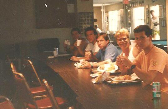 Refeitório do Baseball School: eu, Chitão, Leo, Jorge e Castor.