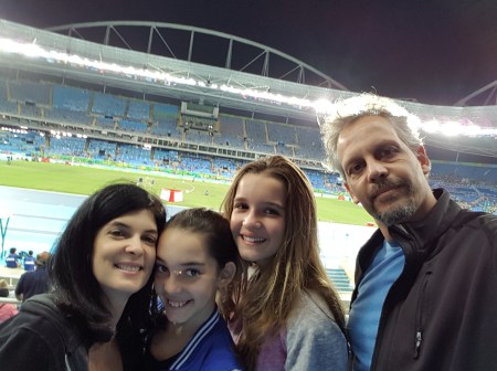 Café da manhã e mais uma refeição qualquer no dia… Marina e Carlos estavam com um par de ingressos extras e chamaram as meninas para uma Rotina Técnica de Duetos do Nado Sincronizado. Fiquei passeando com a Tutu no PO e ao cair da tarde ouvimos: “prá quem andou dezenas de quilômetros sob um calor de setenta graus, a boa notícia é: vocês chegaram!” – do voluntário na entrada da Arena do Futuro. Imaginei que o jogo das loiras NOR x SUE seria equilibrado, mas foi 33 x 20. Tenho certeza que a Lorena vai voltar com muito mais vontade pros treinos do Zé depois de ver como elas correm.
