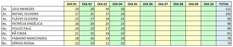 Segue a classificação atualizada do bolão após o quarto dia de provas de natação em Budapeste. Rafael Oliveira teve um péssimo dia e agora Lelo reina isolado na liderança.