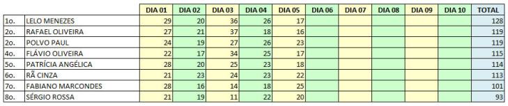 Sérgio Rossa mostrou que está em recuperação ao acertar todos os medalhistas do revezamento 4×200 feminino e agora promete deixar a lanterna nas próximas rodadas. Paul também vem mantendo uma performance regular e agora disputa a medalha de prata com Rafael Oliveira.