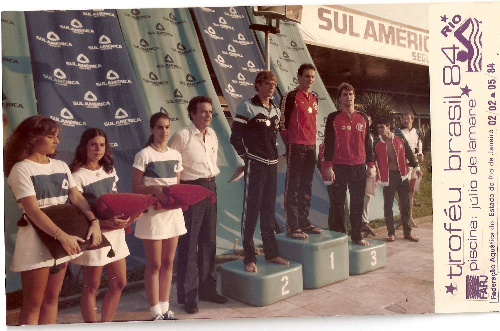 O pódio de 1984: Goldenstein ouro, Eduardo Macedo de Oliveira (MTC) prata e Ronald Menezes (CRF) bronze. Na foto ainda dá para ver o sexto colocado, Alexandre Reis Neto (FFC) e Ricardo Bianco (ECP), que foi sétimo. (Foto tirada do facebook do medalhista de prata, Oliveira)