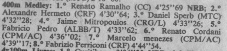 No dia 30 de junho de 1989, portanto há exatos trinta anos, eu tive meu dia de “felizão”. Classificado para a final dos 400m Medley do Finkel daquele ano com o primeiro tempo, nadei a final na raia quatro. Vejam abaixo o balizamento da final, com o dia e tudo.
