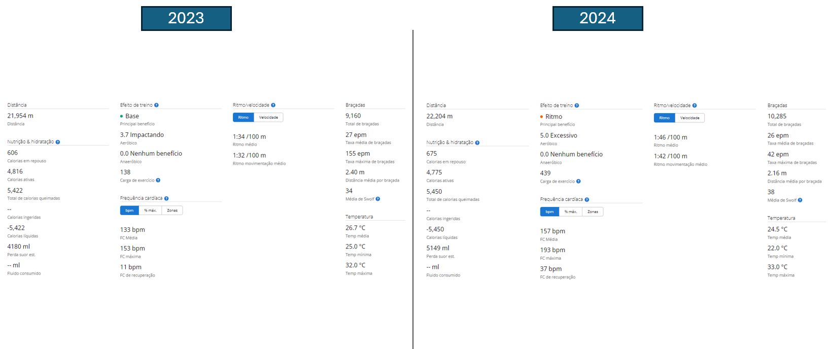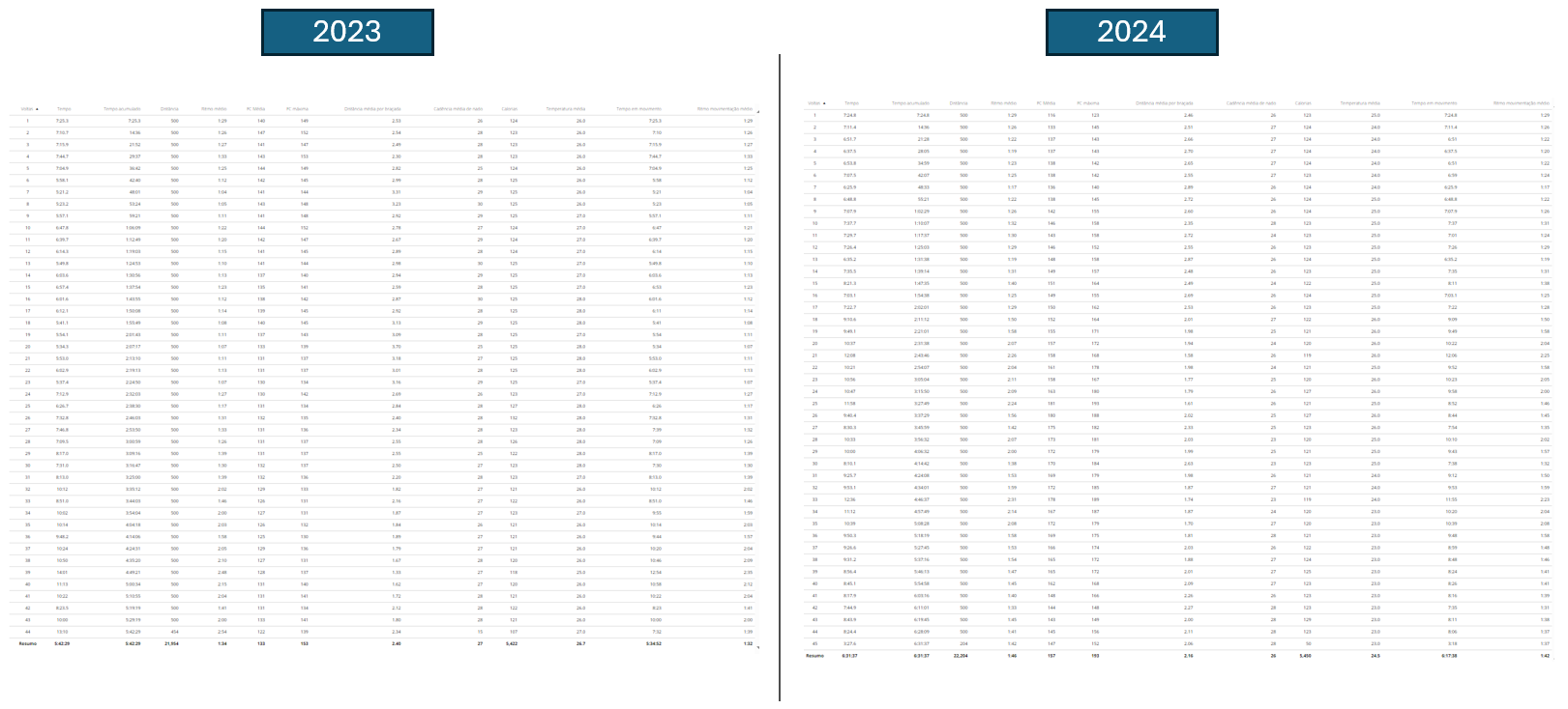 Comparando as Médias por 500m entre as provas de 2023 e 2024 (Garmin)