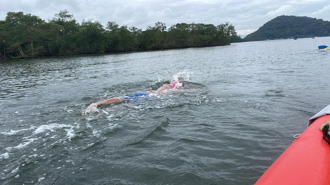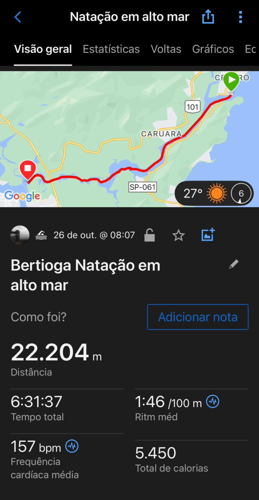 Sobre a “derrocada”: como enxergo mal, não sei avaliar com precisão. Acho que todo mundo sofreu… mas perdi algumas posições ali pelo Km 6-7 quando ainda tinha um pequeno pelotão que foi se desfazendo aos poucos. Depois fiquei mais ou menos na mesma, creio. O LAM me reportou que fui ultrapassado, mas também ultrapassei alguns nadadores no fim da prova na região da Ponte da Piaçaguera-Guarujá. Nessa altura eu só queria chegar…