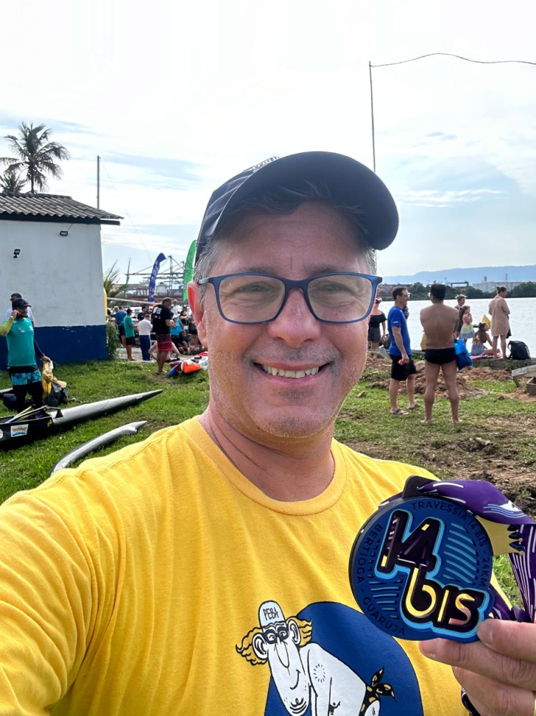 Mas o tempo passa e as disposições mudam. Parei de nadar “a sério” depois que me formei e comecei a trabalhar, mas nunca parei de nadar. Comecei a ir em competições Master com os amigos Pebas e por um bom tempo ainda fiquei focado nas provas de peito e medley. Mas, em paralelo, comecei a pegar gosto por águas abertas e passei a curtir pequenas travessias no mar. Fiz várias e, apesar de ruim pacas, notei que curtia mais nadar no mar que as competições de piscina. Os meus treinos, em geral sem um técnico na borda, ficaram menos estruturados e mais “rodados” – sem muitas séries de intensidade – também pareciam servir melhor a longas distâncias. Foi aí que conheci a turma do Paineiras que treinam só pra fazer travessias e uma coisa levando a outra, acabei sendo desafiado a fazer a famigerada 14 Bis em 2022, já com 50 anos de idade. Treinei bastante naquele ano, fazendo muita metragem e mantendo a disciplina de treinos bem longos (acima de 10km) nos finais de semana. Duas vezes nadei acima de 15km na piscina, testei alimentação e hidratação e até comprei um caiaque, já contando com o apoio do companheiro de treinos diários: O meu compadre LAM (Luiz Alfredo Mäder) para ser meu barqueiro de apoio. Mas o meu objetivo de verdade era apenas completar os 24Km nadados. Junto com quase 300 outros nadadores, fui “de boa”, o clima ajudou e fiz 5h44min naquela primeira 14 Bis, o que considerei excelente (4o lugar na minha categoria) – especialmente por ficar abaixo das 6horas. No ano seguinte, treinei um pouco menos, mas mantive a disciplina e os treinos longos e a intensidade. Apesar de um pouco mais velho, de novo com apoio do LAM- agora mais experiente no caiaque, fui ainda melhor: 5h36min (1o na categoria). Contudo, em retrospecto, deveria ter prestado mais atenção no final de prova que foi difícil, com uma queda séria no meu ritmo que foi de 1´30/100m por boa parte da prova para uns 2´/100m nos últimos 3km…