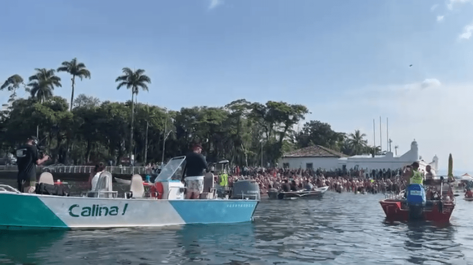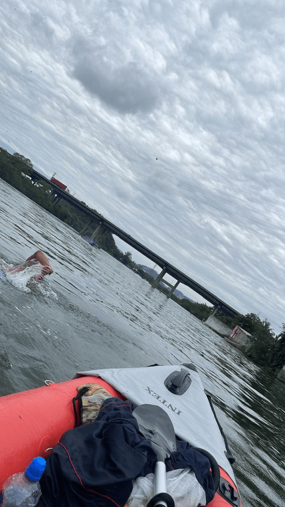 Caiaque inflável é super prático e super confortável, acompanhar o nadador foi moleza, um passeio ecológico relaxante, nas edições de 22 e 23… mas o caiaque inflável também é super leve, cada vez que parava de remar pra pegar alguma guloseima, ou simplesmente reiniciar o regressivo do celular, a leve e constante brisa o levava em outra direção… daí mais 2-3 minutos pra alcançar o nadador novamente.