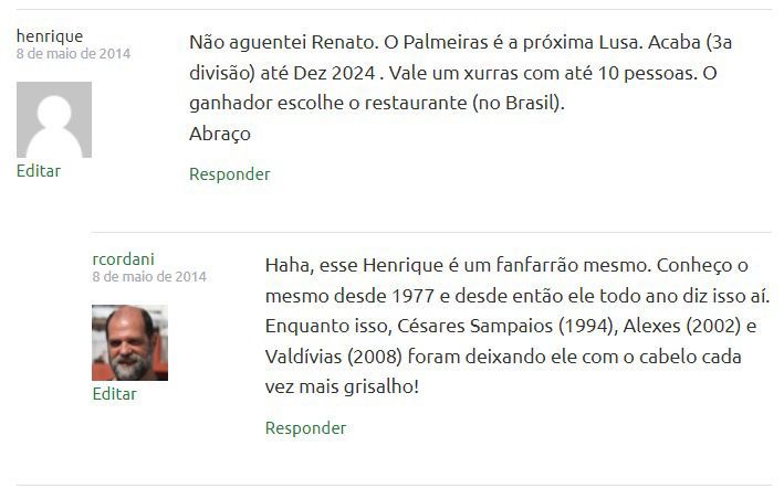 Foi aí que meu amigo Henrique (este aqui) resolveu comentar o post fazendo uma chacota com o Palmeiras, apostando que o time acabaria em no máximo 10 anos. O comentário pode ser lido ainda hoje no post, mas pinço aqui para o leitor preguiçoso: