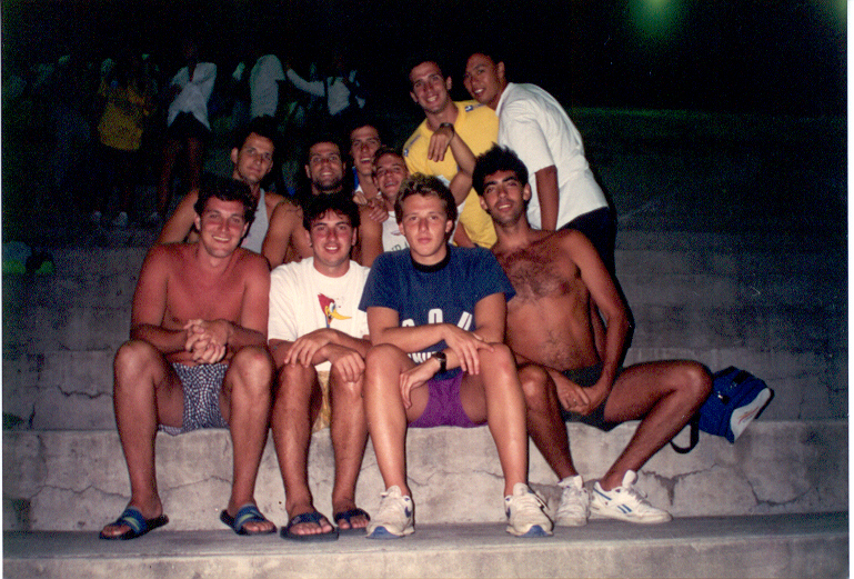 Torcida jan 1994. Embaixo: Polaco, Salsa, Mauro Castro e Pacheco. Em cima: Esmaga, Renato, Chulé, Piu Piu (fazendo sinal de “manhã”) Cassiano e Tamanaha.