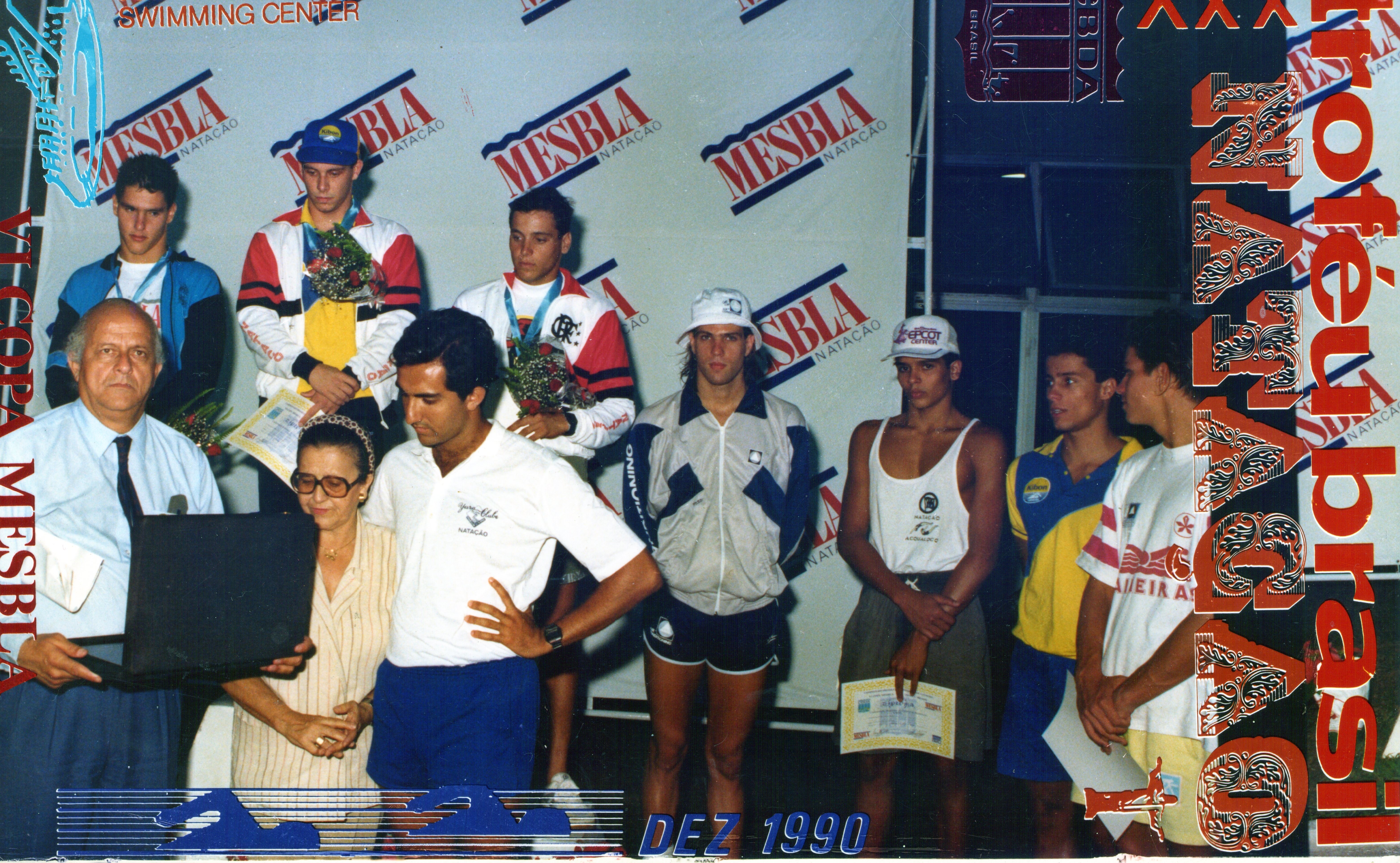 1990, Hermeto ganhando um de seus inúmeros ouros em TB. Na ocasião, bateu o RB de longa que ainda era vigente em 1993. Eu, Oscar, Munhoz e Lelo amargando diplominhas três anos antes dos fatos narrados nesse post.